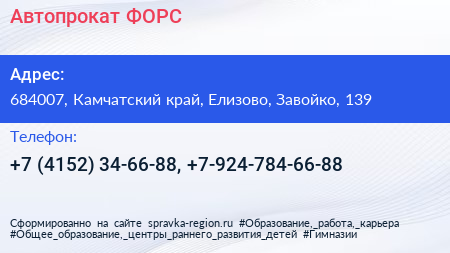 Автопрокат ФОРС по адресу 684007, Камчатский край, Елизово, Завойко, 139 в дальнейшем Организация, размещена в следующих категориях: