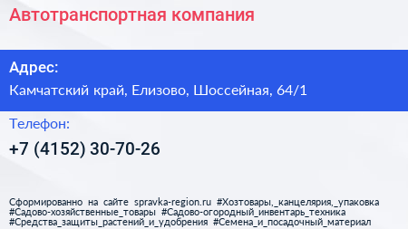Автотранспортная компания по адресу Камчатский край, Елизово, Шоссейная, 64/1 в дальнейшем Организация, размещена в следующих категориях:
