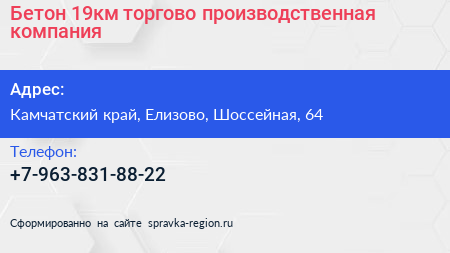 Бетон 19км, торгово-производственная компания по адресу Камчатский край, Елизово, Шоссейная, 64 в дальнейшем Организация, размещена в следующих категориях: