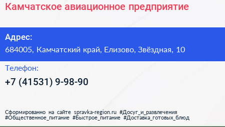Камчатское авиационное предприятие по адресу 684005, Камчатский край, Елизово, Звёздная, 10 в дальнейшем Организация, размещена в следующих категориях: