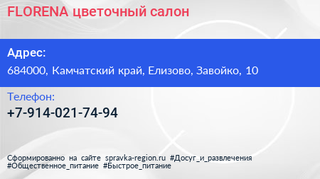 FLORENA, цветочный салон по адресу 684000, Камчатский край, Елизово, Завойко, 10 в дальнейшем Организация, размещена в следующих категориях: