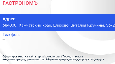 ГАСТРОНОМЪ по адресу 684000, Камчатский край, Елизово, Виталия Кручины, 36/2 в дальнейшем Организация, размещена в следующих категориях: