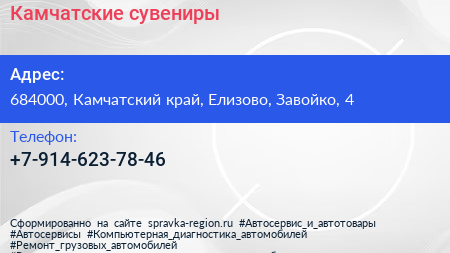 Камчатские сувениры по адресу 684000, Камчатский край, Елизово, Завойко, 4 в дальнейшем Организация, размещена в следующих категориях: