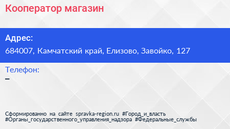 Кооператор, магазин по адресу 684007, Камчатский край, Елизово, Завойко, 127 в дальнейшем Организация, размещена в следующих категориях: