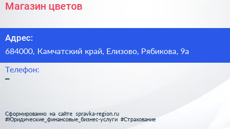Магазин цветов по адресу 684000, Камчатский край, Елизово, Рябикова, 9а в дальнейшем Организация, размещена в следующих категориях: