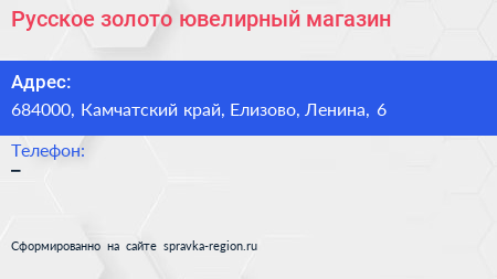 Русское золото, ювелирный магазин по адресу 684000, Камчатский край, Елизово, Ленина, 6 в дальнейшем Организация, размещена в следующих категориях: