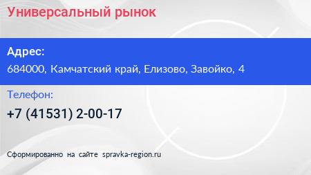 Универсальный рынок по адресу 684000, Камчатский край, Елизово, Завойко, 4 в дальнейшем Организация, размещена в следующих категориях: