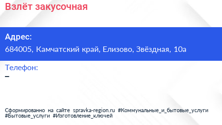 Взлёт, закусочная по адресу 684005, Камчатский край, Елизово, Звёздная, 10а в дальнейшем Организация, размещена в следующих категориях: