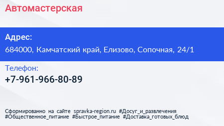 Автомастерская по адресу 684000, Камчатский край, Елизово, Сопочная, 24/1 в дальнейшем Организация, размещена в следующих категориях: