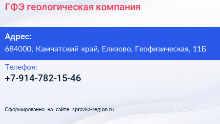 ГФЭ, геологическая компания по адресу 684000, Камчатский край, Елизово, Геофизическая, 11Б в дальнейшем Организация, размещена в следующих категориях: