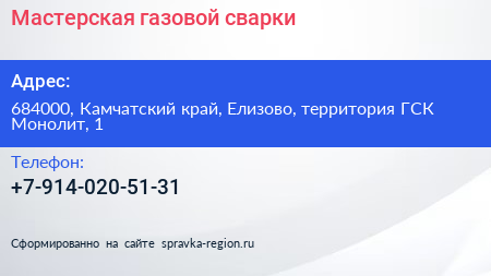 Мастерская газовой сварки по адресу 684000, Камчатский край, Елизово, территория ГСК Монолит, 1 в дальнейшем Организация, размещена в следующих категориях:
