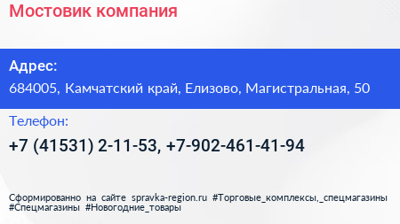 Мостовик, компания по адресу 684005, Камчатский край, Елизово, Магистральная, 50 в дальнейшем Организация, размещена в следующих категориях: