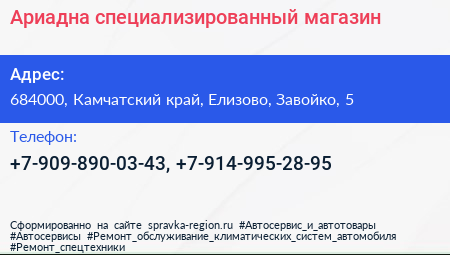 Ариадна, специализированный магазин по адресу 684000, Камчатский край, Елизово, Завойко, 5 в дальнейшем Организация, размещена в следующих категориях: