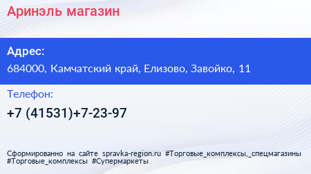 Аринэль, магазин по адресу 684000, Камчатский край, Елизово, Завойко, 11 в дальнейшем Организация, размещена в следующих категориях: