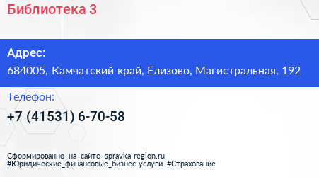 Библиотека №3 по адресу 684005, Камчатский край, Елизово, Магистральная, 192 в дальнейшем Организация, размещена в следующих категориях: