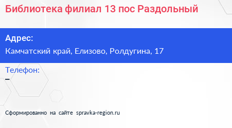 Библиотека-филиал №13, пос. Раздольный по адресу Камчатский край, Елизово, Ролдугина, 17 в дальнейшем Организация, размещена в следующих категориях: