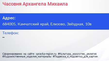 Часовня Архангела Михаила по адресу 684005, Камчатский край, Елизово, Звёздная, 10в в дальнейшем Организация, размещена в следующих категориях:
