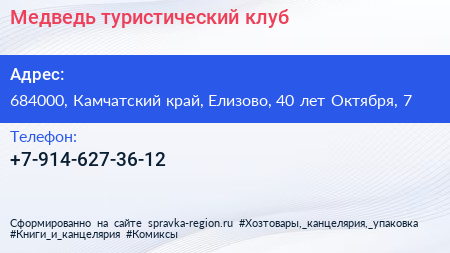 Медведь, туристический клуб по адресу 684000, Камчатский край, Елизово, 40 лет Октября, 7 в дальнейшем Организация, размещена в следующих категориях: