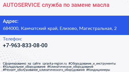AUTOSERVICE, служба по замене масла по адресу 684000, Камчатский край, Елизово, Магистральная, 2 в дальнейшем Организация, размещена в следующих категориях: