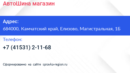 АвтоШина, магазин по адресу 684000, Камчатский край, Елизово, Магистральная, 1Б в дальнейшем Организация, размещена в следующих категориях: