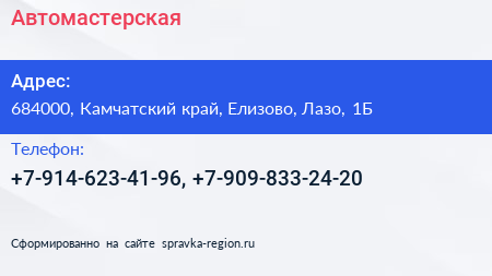 Автомастерская по адресу 684000, Камчатский край, Елизово, Лазо, 1Б в дальнейшем Организация, размещена в следующих категориях: