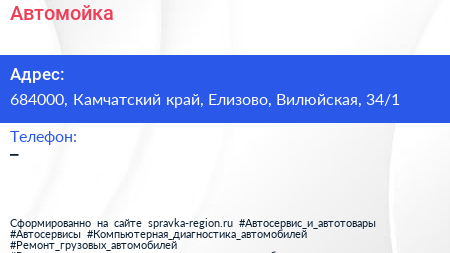 Автомойка по адресу 684000, Камчатский край, Елизово, Вилюйская, 34/1 в дальнейшем Организация, размещена в следующих категориях: