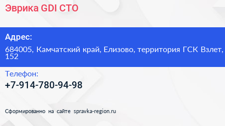 Эврика-GDI, СТО по адресу 684005, Камчатский край, Елизово, территория ГСК Взлет, 152 в дальнейшем Организация, размещена в следующих категориях: