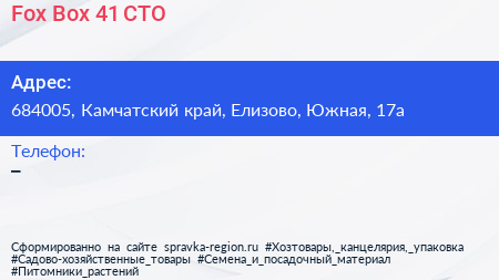 Fox Box 41, СТО по адресу 684005, Камчатский край, Елизово, Южная, 17а в дальнейшем Организация, размещена в следующих категориях: