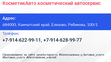 КосметикАвто, косметический автосервис по адресу 684000, Камчатский край, Елизово, Рябикова, 100/1 в дальнейшем Организация, размещена в следующих категориях: