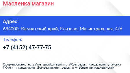 Масленка, магазин по адресу 684000, Камчатский край, Елизово, Магистральная, 4/6 в дальнейшем Организация, размещена в следующих категориях: