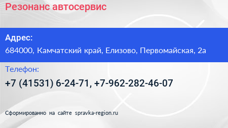 Резонанс, автосервис по адресу 684000, Камчатский край, Елизово, Первомайская, 2а в дальнейшем Организация, размещена в следующих категориях: