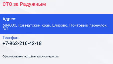 СТО за Радужным по адресу 684000, Камчатский край, Елизово, Почтовый переулок, 3/1 в дальнейшем Организация, размещена в следующих категориях:
