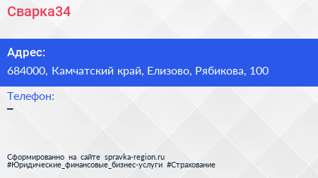 Сварка34 по адресу 684000, Камчатский край, Елизово, Рябикова, 100 в дальнейшем Организация, размещена в следующих категориях: