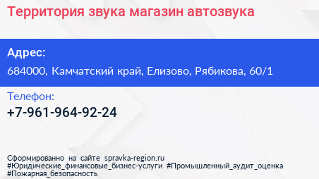 Территория звука, магазин автозвука по адресу 684000, Камчатский край, Елизово, Рябикова, 60/1 в дальнейшем Организация, размещена в следующих категориях: