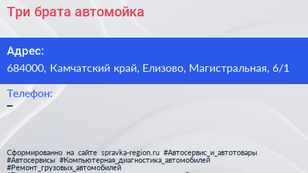 Три брата, автомойка по адресу 684000, Камчатский край, Елизово, Магистральная, 6/1 в дальнейшем Организация, размещена в следующих категориях: