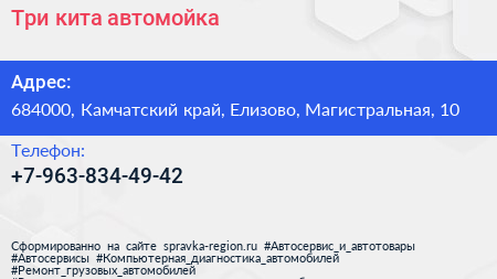 Три кита, автомойка по адресу 684000, Камчатский край, Елизово, Магистральная, 10 в дальнейшем Организация, размещена в следующих категориях: