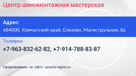 Центр, шиномонтажная мастерская по адресу 684000, Камчатский край, Елизово, Магистральная, 8а в дальнейшем Организация, размещена в следующих категориях: