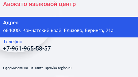 Авокэто, языковой центр по адресу 684000, Камчатский край, Елизово, Беринга, 21а в дальнейшем Организация, размещена в следующих категориях: