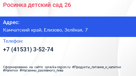 Росинка, детский сад №26 по адресу Камчатский край, Елизово, Зелёная, 7 в дальнейшем Организация, размещена в следующих категориях: