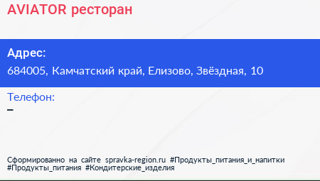 AVIATOR, ресторан по адресу 684005, Камчатский край, Елизово, Звёздная, 10 в дальнейшем Организация, размещена в следующих категориях: