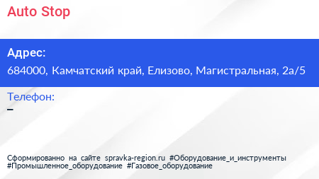 Auto Stop по адресу 684000, Камчатский край, Елизово, Магистральная, 2а/5 в дальнейшем Организация, размещена в следующих категориях: