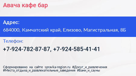 Авача, кафе-бар по адресу 684000, Камчатский край, Елизово, Магистральная, 8Б в дальнейшем Организация, размещена в следующих категориях: