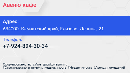 Авеню, кафе по адресу 684000, Камчатский край, Елизово, Ленина, 21 в дальнейшем Организация, размещена в следующих категориях: