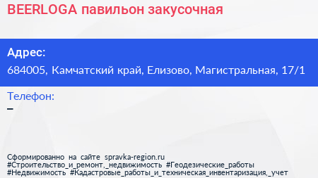 BEERLOGA, павильон-закусочная по адресу 684005, Камчатский край, Елизово, Магистральная, 17/1 в дальнейшем Организация, размещена в следующих категориях: