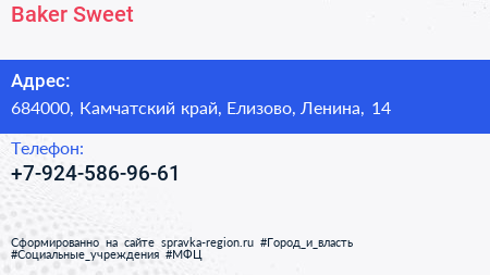 Baker Sweet по адресу 684000, Камчатский край, Елизово, Ленина, 14 в дальнейшем Организация, размещена в следующих категориях:
