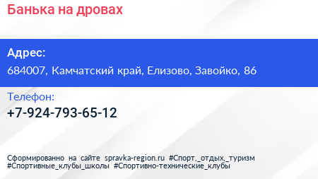 Банька на дровах по адресу 684007, Камчатский край, Елизово, Завойко, 86 в дальнейшем Организация, размещена в следующих категориях: