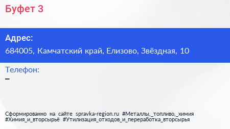 Буфет №3 по адресу 684005, Камчатский край, Елизово, Звёздная, 10 в дальнейшем Организация, размещена в следующих категориях: