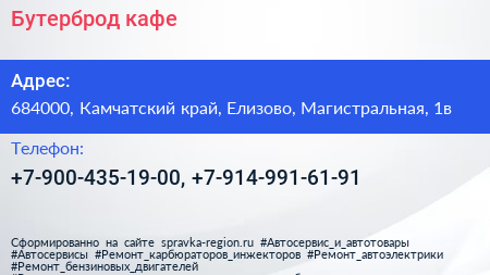 Бутерброд, кафе по адресу 684000, Камчатский край, Елизово, Магистральная, 1в в дальнейшем Организация, размещена в следующих категориях: