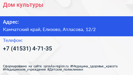 Дом культуры по адресу Камчатский край, Елизово, Атласова, 12/2 в дальнейшем Организация, размещена в следующих категориях: