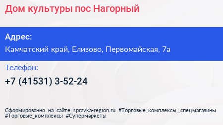 Дом культуры, пос. Нагорный по адресу Камчатский край, Елизово, Первомайская, 7а в дальнейшем Организация, размещена в следующих категориях:
